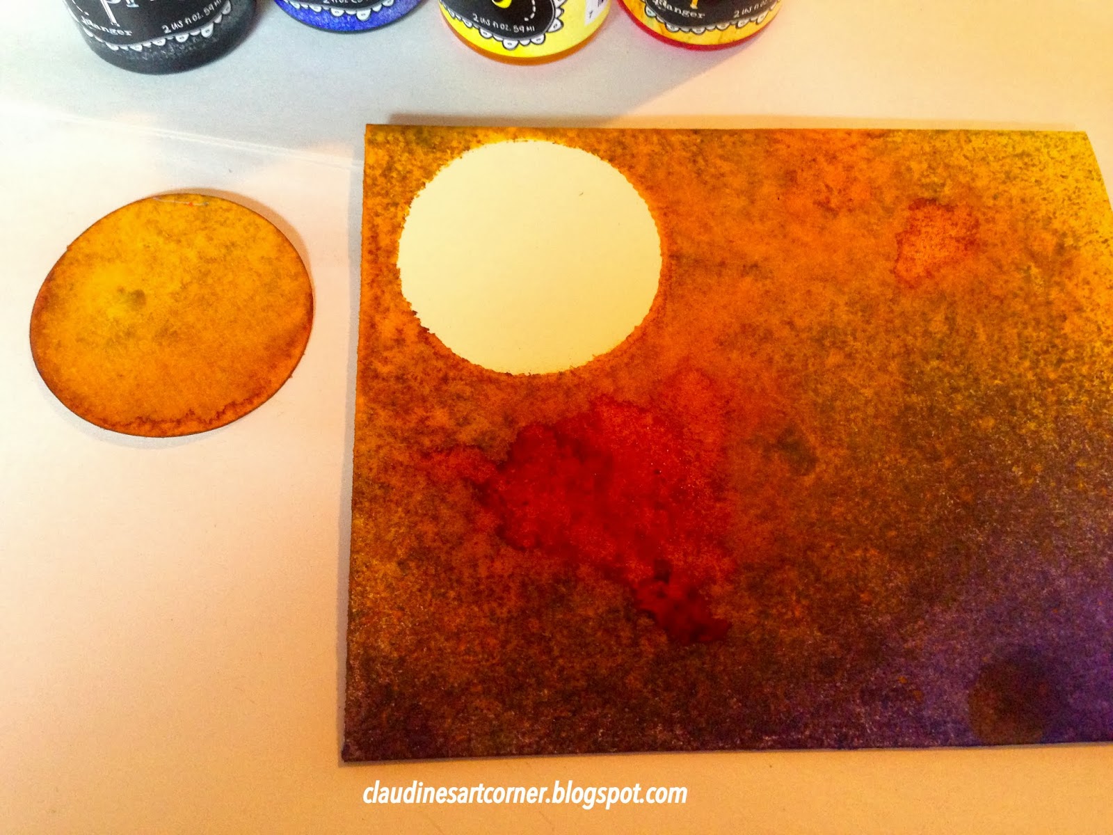 I used another piece of cardstock where my circle was punched out of and covered my card and filled in my moon with Distress Inks in various colors.